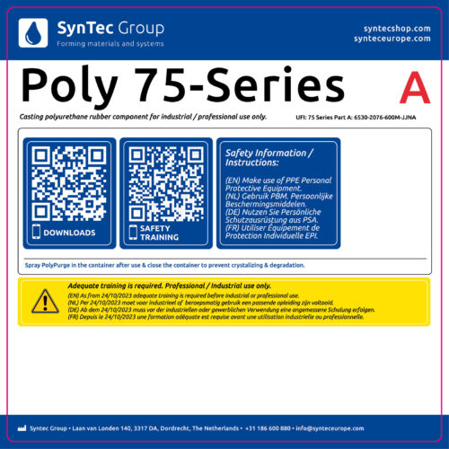 The two components rubber Poly 75-75 is a very stiff polyurethane rubber that cures at room temperature (RTV). The Poly 75-75 has a Shore A 75 that is just a bit stiffer than a car tire. The very hard rubber is extremely good with applications as used in the concrete industry. The Poly 75-75 is widely used for making large molds and bulkheads for the prefab concrete. The Poly 75-75 and Poly 75-90 are also widely used in the production of hard rubber parts. The Poly 74 and 75 series rubbers can be used as casting rubber, brush rubber or spray rubber.